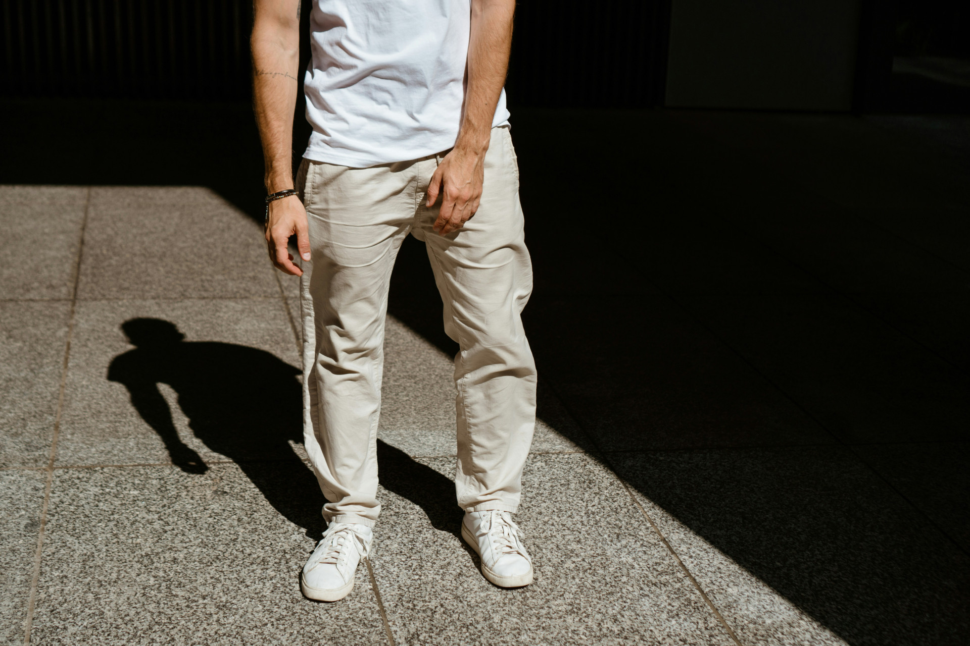 - Tjek længden – Bukser, der er for lange, folder ved anklerne og ser hurtigt slidte ud. De skal netop røre skoen uden at danne dybe folder.